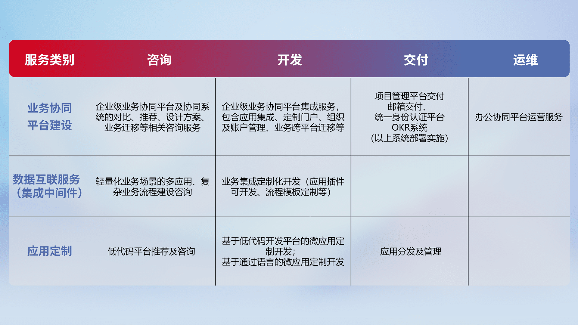 针对钉钉、、、、企微、、、、IDaas等平台级产品提供产品的规划、、方案、、、、交付、、定制化开发等服务,,,实现如统一协同办公、、、、智能客户服务、、、、混合会议管理、、、智能数据查询、、、、等业务场景,,,实现数字化转型。。。
